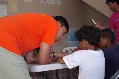 Each team had volunteers as group leaders (our eldest 2 acted as group leaders for Los Piratas, and Estrellas Del Mar) who led them through 4 classrooms : Health, Spanish/Literacy, English, and Environment. Here Arman is getting Los Piratas ready for lessons.